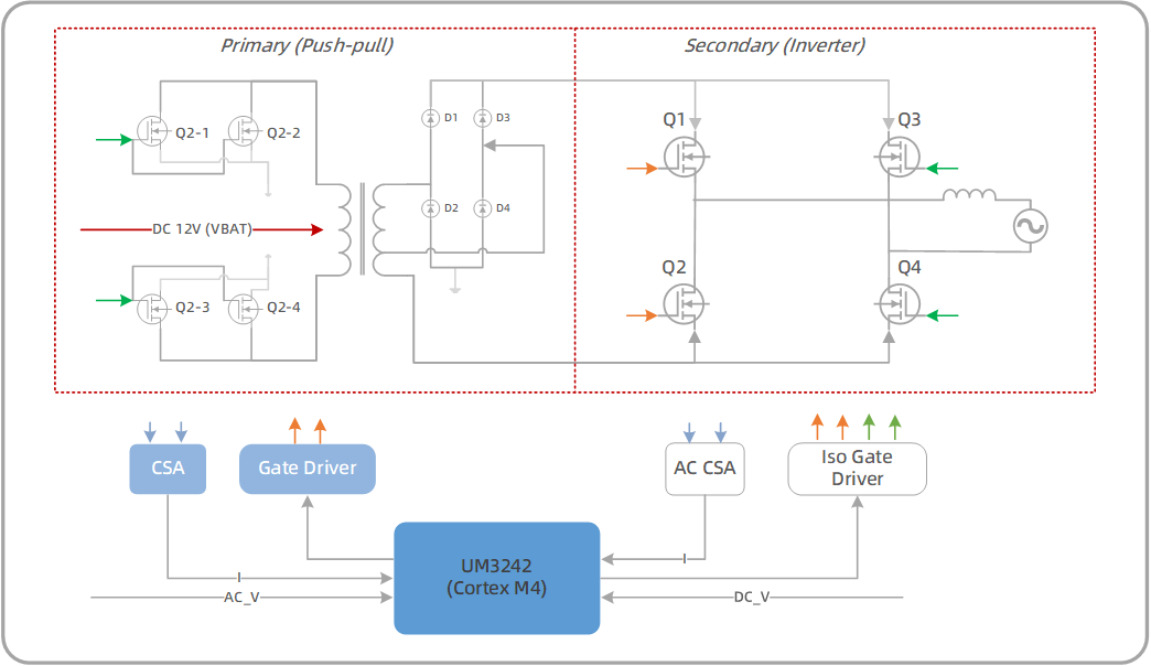 單向逆變,前級(jí)采用推挽架構(gòu),后級(jí)采用全橋逆變