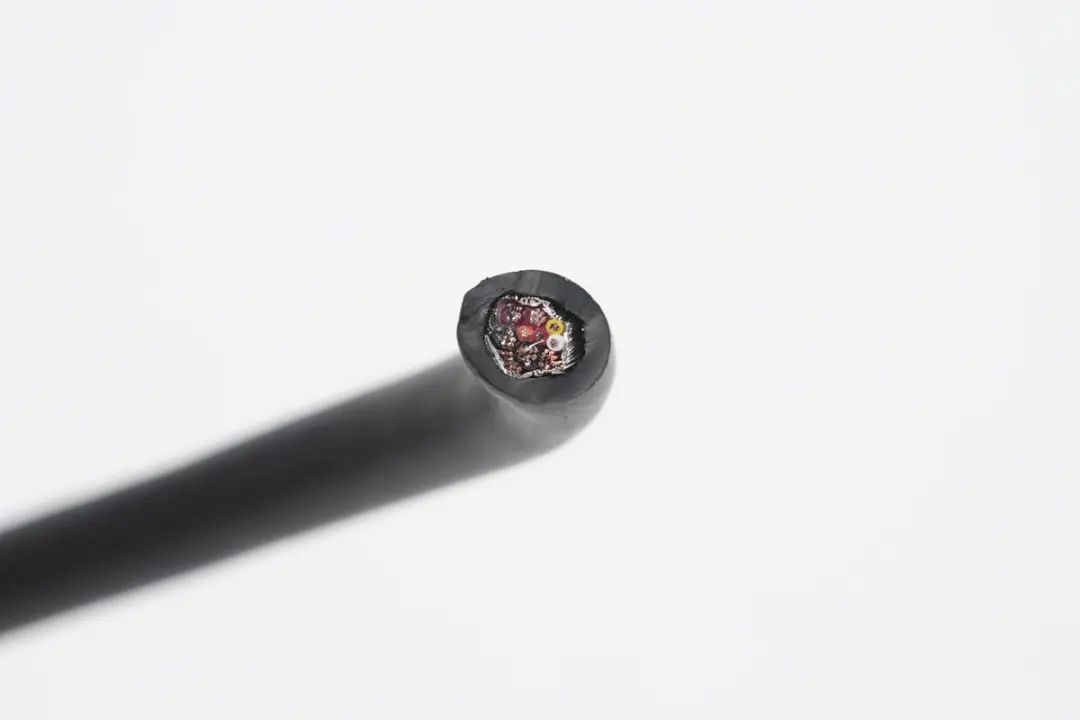 最后是線纜的拆解,線纜截斷橫截面一覽,線纜內芯外罩屏蔽層,內部8根線纜用于電力傳輸和數據傳輸。