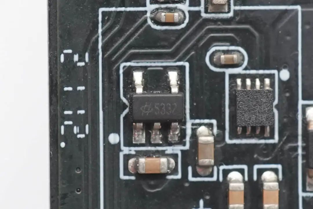 為LED背光和UM3506芯片供電的穩壓芯片,絲印5332,來自Holtek合泰,型號為HT7533-2,輸入耐壓33V,輸出電壓3.3V,最大輸出電流100mA,采用SOT23-5封裝。