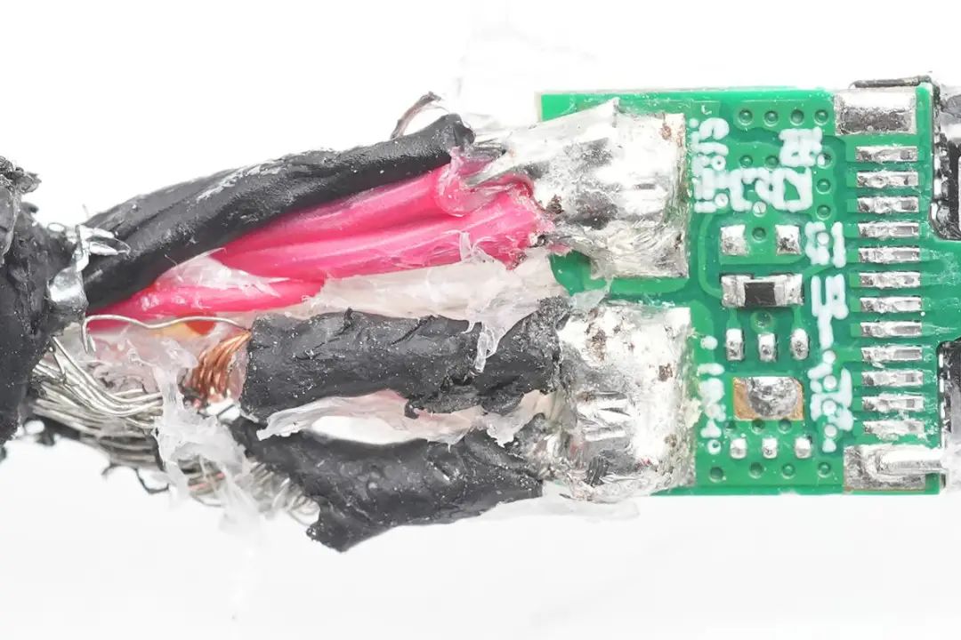 首先沿側面切開端子外殼,外殼為整體注塑,線纜焊接處通過硬膠固定。