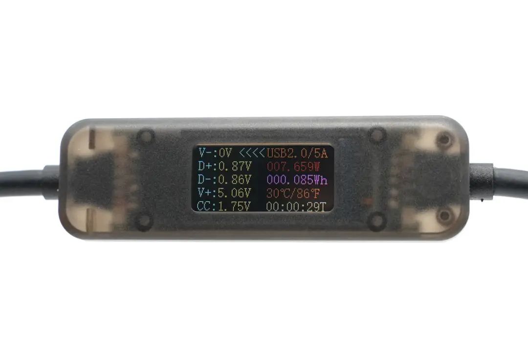 顯示界面2如圖,可以顯示充電負電壓(V-)、數據端口電壓(D+、D-)、充電正電壓(V+)、數據型號電壓(CC)、數據類型/最大電流、充電功率、容量、溫度、計時器。